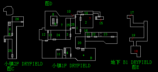 在三个(25)房间内将肖像画的生辰巧妙组合,再进入(26)在此中的柜子按“4487”密码可得到“圣水”并拿到空油桶,可在☆处用加油机注满油交给②处的老人后,如需BP和EXP可将地图中所有敌人消失,在(12)中有剧情,过后来到⑥在床中调查并休息。醒后与BOSS对决……胜利后,下楼时小心。与老人交谈后,交给你“卡车钥匙”。切换屏幕后再回来,老人不见了。到(15)中找到老人并打开铁箱子得到武器。接下来,到②中坐上卡车,离开这个干旱之镇。
