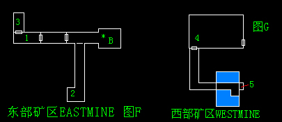 来到一座矿山前受到狙击,车子发生故障,前方也没有了路,只好进入东部矿区,来到①时桥断无法前进,回到②拿到木板来到,①借助木板过桥,进入③调查屋角装置,将装置左上方插片取出插入第二个孔内再打开左侧开关,③旁的门便可打开,进入西部矿区先干掉BOSS两次得到武器与“插片”,再调查摩托车④发现开关并打开,然后回到东部矿区的③,将装置的两个插片分别插在1和4的位置上再打开开关,这时再去④打开摩托车开关,面前光亮处的门便可以打开,从⑤处乘电梯下入基地内部(以上见图F、G)。