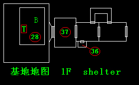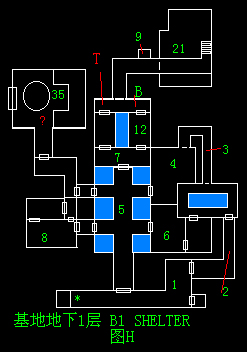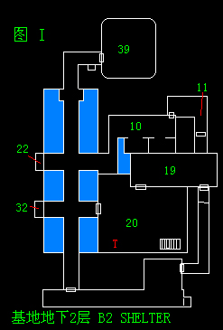 地图的看法:红色三角为主人公所在地,蓝色方块为“门”如画有黄色“钥匙”的地点则需钥匙或磁卡进入,绿色“T”字为电话(存盘点)黄色“B”为置物柜(并不互通,切记!)大片的红色区域表示有敌人或目的地,各位!小心了!!