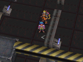 找到贝克罗斯后所有的同伴就算找齐了。众人再回到实验工场,这时要注意将队伍组合成龙、小桃、培克洛。在实验工厂中工人说实验室中有一股十分怪异的气体,并希望龙可以利用石头将温室屋顶打破令气体放出,龙当然要帮助他了。在这里必须利用贝克罗斯的特技,首先按加速跑,然后在画有"×"的地方把石头奋力踢下去,如此便可以将两处温室的天窗击碎,这样那股气体便可放出。之后三人来到一间房屋内,利用小桃的特技将壁炉门击破,便可进入秘密通道。在这里有许多超科学的装置,而且有的门必须要用密码才能打开,其中有三道门,只要细心寻找密码便可轻松使之打开,第二道门的密码在一间有放射光线的房间里,因为有时间限制有点难找,具体位置看右图:第三道门的密码在一本笔记本上,具体位置见左图: