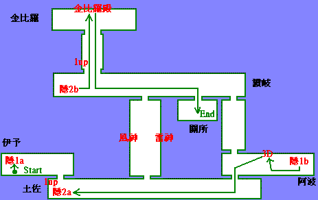 攻略流程 : 此关只要拿到3个通行证至关所大门处即可过关. 如上图所示 ,1 up随您高兴拿,金刀比罗殿一定要去参观,如各位有去日本土佐也一定要记得去喔!……