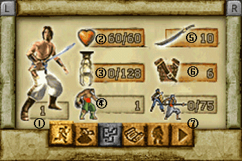 先拿到第7个卷轴,提示玩家在左下角出现提示的情况下按SELECT可以更换游戏角色,Farah是弓箭手,让她上到右边射击钟摆似的东西,左侧的门就会打开,到隔壁房间先用Farah射右边的钟摆,然后让主角爬到第1根绳子顶端向左跳,经过几根绳子和铁杆后踩到左边开关,这样就可以进入右边的房间了,右边的房间左上平台上有个罐子,里面是“Antidote”(解毒剂),右上角的房间要有完整的壁玉徽章(Medal