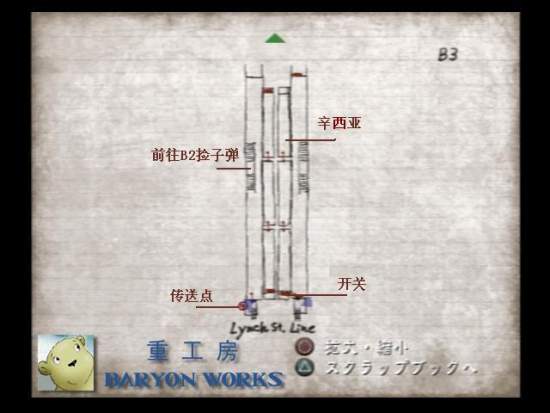 终于我们又再次来到这个地方,这时却见到了一个熟人辛西娅(シンシァ),可以说只有躯壳还是而已(午夜凶铃美版)。友情提示:这里起就不要走得太快,艾琳会跟不上的!从左边的入口进去然后一路上按第一次的行进路线前进。车厢上的那个箱子可以用刚才的得到那把钥匙打开~恶,好脏的硬币。从B3的传送点(前面有图,请自行翻阅)回主角的方间。在房门口会有东西,然后去厨房把硬币洗干净后变成1元的硬币。到B3的右面一个自动贩卖机把1元的硬币放进去后得到杀人现场的钥匙,然后准备下到B4但是艾琳手受伤下不去就只好让她在那等主角。主角独自来到辛西娅遇害地附近调查可以得到车票。这就可以随便走哪一边的检票口了。得到车票后用杀人现场的钥匙打开辛西娅遇害的那个房间,得到电车的拔子。现在两边都可以走了就回去带上MM下到B4,进门就把归服の剑(一定要拿,还有就是一定不要用了~后面有大用处) 拿到手里。在车头使用电车的拔子,这时两辆车之间就会出现一个缝隙,赶快进去吧!这里,是通往地狱吗,还是天堂。中途的传送点最好回去一下。
