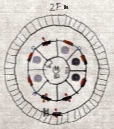 1F外面那个圆形通道没啥特别的有门就进~拿一下子弹啊.文件什么的。进入后有传送点。大门口又有一封信!得到赤の日記。接下来我们走左边的那个门从B1到B2。进入B2房间后取得一个水牢钥匙(这里有传送点)然后进门接着前进,一个大门打不开~我们就只好原路返回了。然后进去1F传送点房间的另一个门。前行一段时间后有一处上下选择,中间还有一个门。我们先进中间那个门看下。2F里面的一个房间的左边墙上有一排文字,有什么用也不知道先记下好了。出门后上楼梯到3F进去后先拿下东西和看一下墙上的字,然后进左下的那个房间一阵狂跳,出门来到水塔中心部分。爬梯子上到3F(这里还可以上4F记得去把那个水闸打开哦)后把那个方向盘像左边转动,然后把墙上的密码拿到手。下楼后就会有情节。接下来回到3F,用中间的那个方向盘调整洞的位置(调成图3F样子就OK了),然后到2F一切照图2Fb(注:转动方向盘的时候洞会发生变化)。完成后下楼出门,来到到1F传送点那个房间,接着来到第一次跳洞的3F,新的路我们刚刚已经组合成功了,又是一阵狂跳!跳下后打几个敌人,先别慌着前进打完后转身从后面的门出门。原来这里光线太暗看不见,又只好上楼调整灯光了。整我啊~~