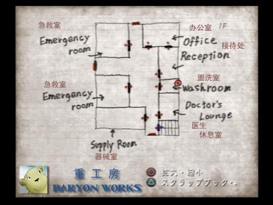 ~~闪先~~啊~~好悠扬的音乐~~~来到写有接待处(Reception)的房间,先拿桌上面的日记,然后来到放光片的地方调查就会有情节~然后上方的办公里有一把小刀的说。盥洗室(Washroom)有传送点,果然是让人轻松的地方(笑)!回去写一笔吧!路上会的到一个女性用包包!即女主角的专用武器。前往医生休息室(Doctor's Lounge)可以顺一个急救包。来到器械室(Suooly Room)有两个敌人,打完后调查架子会得到一定时间体力慢慢恢复的道具。接着从电梯旁边的那间屋上楼!(图1F)