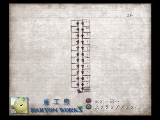 一出来出现在B10就有一个敌人~那就一个烦啊~身边有传送点可以传送回去在门口捡到赤色日记,拿完后就又传送吧。先进入电梯后调查决定楼数的地方,会有三个按键。(上,中,下)先选上吧来到B8,然后上到B5在桌上有生日蜡烛。B3有一个像猫一样的东西!顺手把蜡烛差到生日蛋糕上.去B7的宠物店把猫放在柜台上的笼子里,再回到B8乘坐电梯,这次我们选下好了。来到了B12出门后进入旁边的电梯,下梯子后在走廊处得到ビリヤードの手玉(台球),接着走会有情节最后在B12最后一个门那会有一个バレーボール(排球),然后把台球放在酒吧的台球桌上,排球放在B5放排球的那个篮子里。这时会钟声大响,我们就来到B8的那个有钟的房间后,调查钟就会有新的路了。来到B15的酒吧,在桌上找到一个便签,说的酒吧电话号码已经改变,密码也变为新电话号码的后四位了。哦酱紫阿,我#¥—#·#……·#。那不是我又要回去一次?没法先回家打个555-3750的号码看打得通不!号码拨完电话传出一句话:对不起,你所拨打的电话已改为555-4890。对于由此给大家带来的不便,我们表示歉意。KAO~~~~也好密码手入了。接着下楼打开最后一道门,进去后....墙上好多动画噢(笑)。开打,打完了这章也就OVER了。(注:这里只有攻击了核心敌人(KeyEnemy)才能对所有的动画产生同时打击的效果。仔细找找吧。找到了就表留情了。)在螺旋楼梯中间的传送点记得回去一下,可以在门口得到又赤の日记。