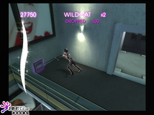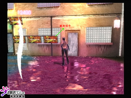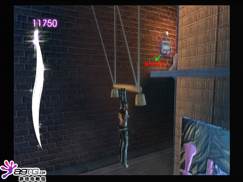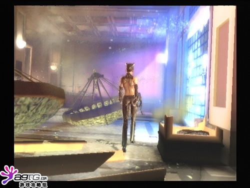 猫女追着敌人来到一间夜总会,先破坏图上那个红色的牌子,右边的灯会爆掉,并出现一条单杠。这里就可以跳过去了。