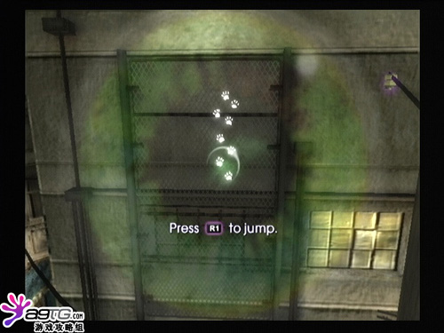 按住L1键可以爬墙,但在墙壁上无法久留,过一会要滑下来。如果爬在铁丝网上就不同了,不会下滑,而且还能移动。在墙壁上按跳跃键R1可以反弹,按下+R1则是安全落下,不管多高都不会费血。而在两个狭窄的墙壁之间弹跳可以越跳越高。