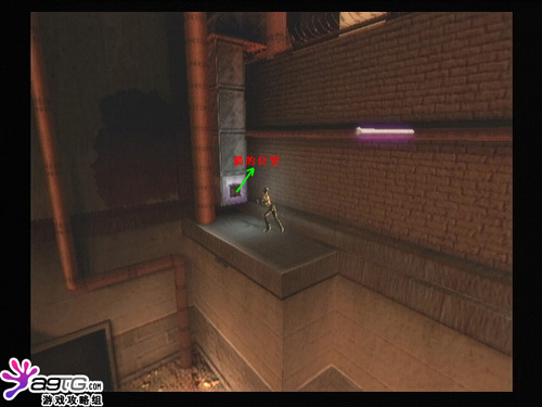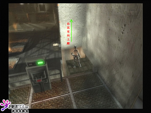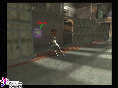 进入工作车间后,破坏对面门前的开关,可以打开控制室的门。进入控制室打开上下2个开关,运送箱子的传送带开始工作。接着去图上位置打开开关,沿着墙爬上去。一直上到传送带旁,跳到箱子上,这里有点难,注意跳跃的力度。