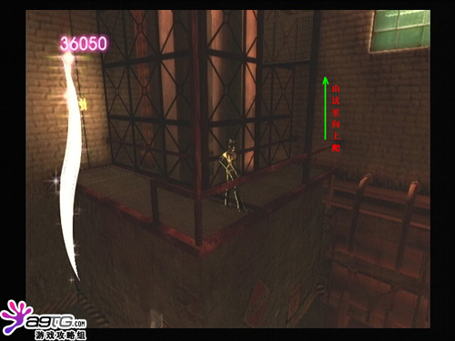 这次的场景似乎是工作车间。打坏左右两边的开关让平台就位,然后利用“猫眼”找到路跳上去。这里要特别提一下,由于视角的原因,跳到右边平台后会看不到路,这里要像图片上一样对着墙壁爬上去,然后反弹,就到达上一层了。