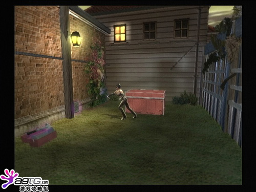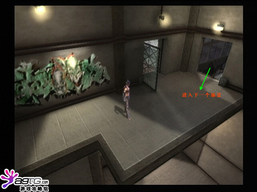 进门后立刻受到警卫围攻,全解决后去2楼。到二楼健身房里的3个小灯处,把灯全部踢坏,屋顶会降下一个巨大的机器,利用单杠跳上去,就可以到2楼的另一侧了。继续前进到门口,要利用鞭子来抓住路灯,跳到对面的小房子里,破坏里面的仪器就可以打开庭院里的另一道门,由屋顶进入里面的房子,之后就简单了