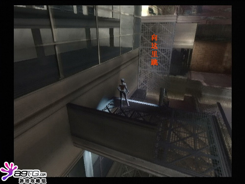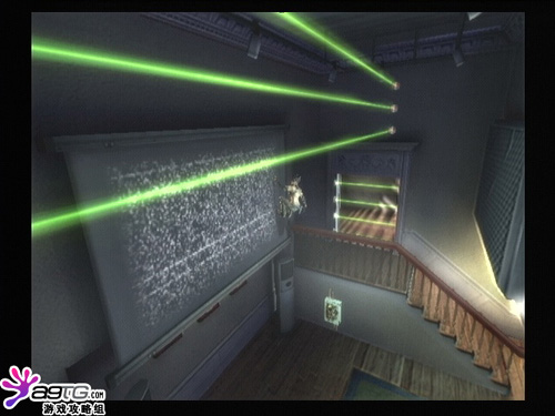 前面又有一个带机关的房间,到下面破坏电源,激光会时开时关。打开门前的开关,对面的门就打开,但如果你一下楼梯门就会自动关闭。这里要从墙壁上的背投之间跳跃,不落地就行了。