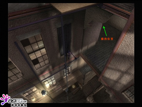 这关的猫不太容易入手,位置是在一开始时有警报器那个地方,两个铁箱子右侧的高台上,要利用单杠和铁丝网绕一个大圈子才能到达。