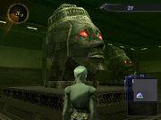 从野外沿路进入了SOLID部落,正好看门的2个士兵被叫开了。萨弗等人顺利地进入了部落城堡。诺大一个城堡,看来士兵都在全力防守,他们的卧室、休息室都是一个人也没有,拿好每个房间的道具后进入了一扇门。里面可以看到一个巨大的红眼睛石像头,和下图一样。但并非下图这个地方哦。
