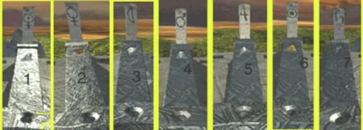 一开始先往左走到祭坛,上去后,看到七根柱子,最上面有星球符号,中间有金属,下面有滚动条。如下图所示: