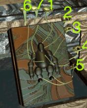 从左手边起,按号码顺序把卷轴拿起来,当你把卷轴拿起时就会说一段故事,拿完也说完,故事内容和星星、金属、意义都有相互关系,把卷轴按照上图,也就是本来正确的顺序依序放回去(第一和第七根滚动条对调)。你就会被送到地下室去,黑漆漆的一片,把狼眼戴上,可以看到一台座,上面放着母亲的尸体,台座下有一圆形物可以转,上面的图形是倒着的(就是家族的狼纹徽章),把圆轮旋转九十度变成正的,按它一下,就会上到树屋里。上楼梯,打开柜子拿出弓箭及兔肉,右边有一抽屉状机器,打开上面抽屉拿出铸模,打开下面抽屉拿金属块,向后转,看到一个大嘴巴机械,靠过去,把右边水闸打开,通水入左边大嘴巴里,放入罗格之泪到大嘴巴里,再放上铸模,再放上金属,金水会被罗格之泪熔化,完成后再把嘴巴加满水,放入罗格之泪,退出,走到左边像鞋柜的机械,打开有一匣子竖起来,上面有一人形,把熔化的金属依下图号码放入。