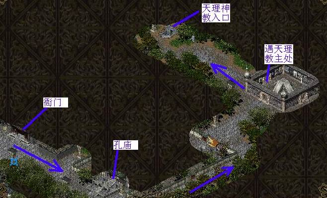 往北走看到一堆人在神侃,口水横飞说的最欢的是天理教主,和他聊两句他会告诉你天理神教入口在西方。