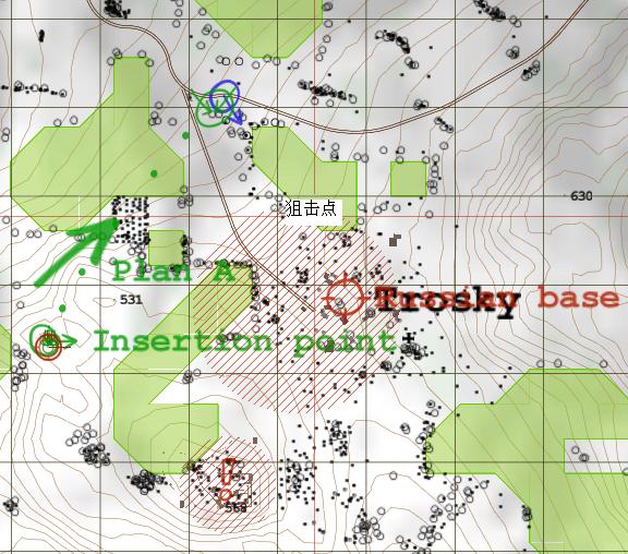 由于我们抢来的弹药车,所以弹药很充足,你可以用SVD Dragunov只要带一枚RPG防身就可以了。任务开始后选择Plan A,然后你就绕到狙击点(见图2)按0-0-1让大家进攻,你用狙击枪打地图上!的地方,先打穿黑衣的Crew(一个也别放过),等手下由你控制后马上让他们回来,等山上的敌人全消灭完了,开始攻打敌人基地,基地的守军很弱,把所有敌人干掉后你最好一个人也不要死,空坦克太多,否则人会不够用的,大家起码要保证T-80和两辆T-72的炮手驾驶到位,开回基地的途中再轰掉两辆坦克就可以了顺利过关了,至于功略上讲的Mi-17空降兵并没有来,真是可惜。