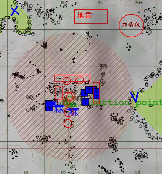 你控制的人就是上一关得留下的人,苏军集结了装甲部队来夺回他们的基地,这一关你自己带上四枚RPG,同样再找个人给你带些弹夹和RPG,其他人也都带上RPG,进入游戏立刻让两个士兵控制两挺M2其他人留在原地他们足够对付苏军的先遣部队,你自己到弹药库拿地雷和炸药包按图4的位置放置,工作中当战友将先遣部队消灭后,让除了为你带弹药的其他人都到X点隐蔽,你的一定动作要快,十分钟后敌人就会开始进攻,按T键你必须在26到27分前撤到V点,并让给你带弹药的人Hold Fire,如果运气好的话地雷以可以把2/3的装甲部队消灭,引爆炸药包时一定要看准时机尽可能消灭多的,这时自己再打两枪所有敌人就全完蛋了,敌人损失惨重而我们是零伤亡,不过这时敌人的直升机也出动了,系统会告诉你往哪儿撤退,先到的是一架V-80 Gunship和一架Mi-24 Hind,紧接着还有Mi-17空降的特种兵和一些坦克会占领基地,不过他们都不会发现你,如果你这是手中还有RPG可以试试打直升机,我就把V-80 Gunship和Mi-24 Hind都轰下来了,真可惜要不是规定撤退我们一定还可以守下去。