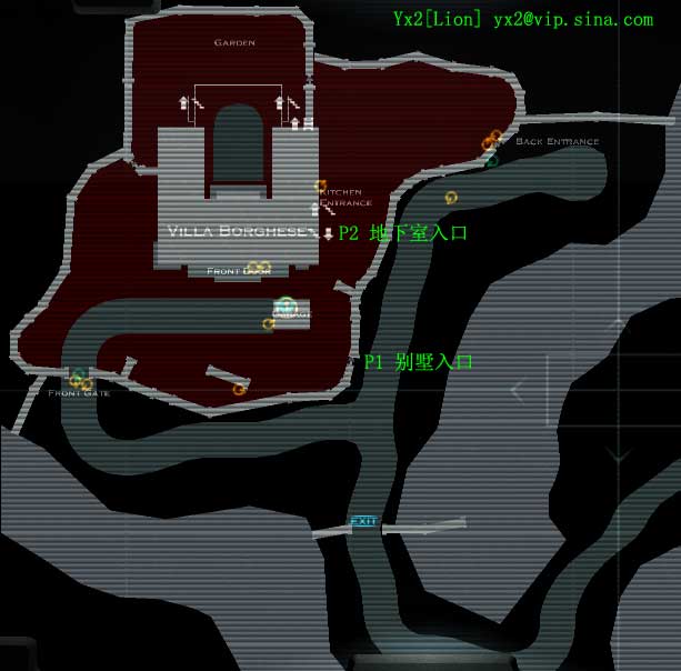 1:杀死Giuliani教父。 2:从他身上得到囚室的钥匙。 3:救出关在地下室的维多利奥。 4:从地图上指定地点脱离。 [P1点会有一个警卫巡视,乘他在门口小便的时候用钢琴线绞死他,把他拖进去换上他的衣服,然后从P2点进入别墅一楼。] |