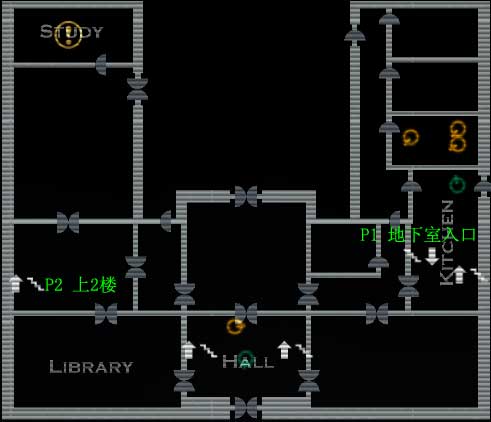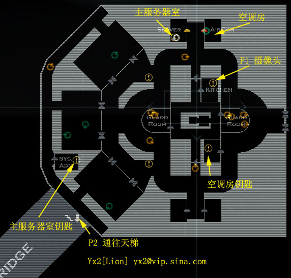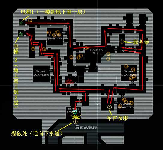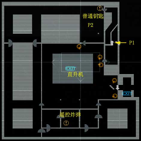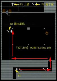 [这关要干掉Masahiro Hayamoto和拿回导弹导航系统,Masahiro Hayamoto在最顶层,导弹导航系统在地下室下面的展览馆。一开始从出口来到城堡一层,要从P2下去拿钥匙和装备。] |