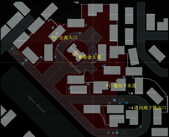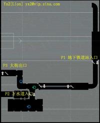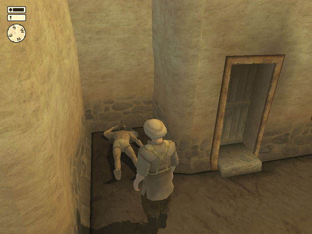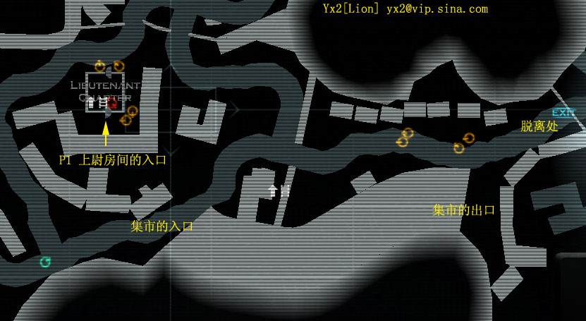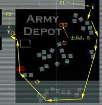 [上校身边一直有个警卫跟着,除了在P1点附近。上校会在P1的中部小便,警卫会背对上校站在门口。事先躲在P1最里面的箱子后面,等上校小便的时候过去绞死他,拿了钥匙,把他拖到箱子后面藏起来,偷偷绕过门口的警卫,出集市。] |