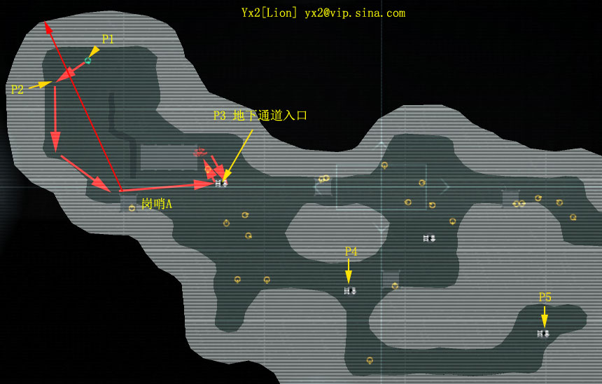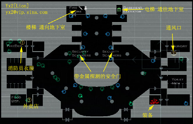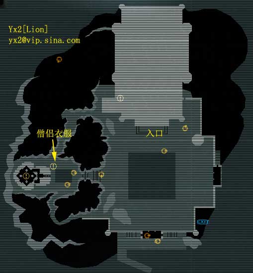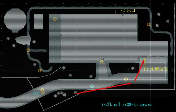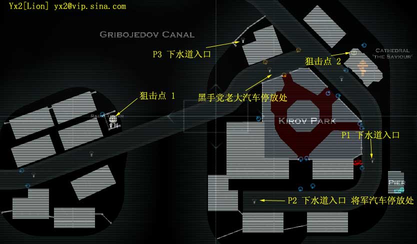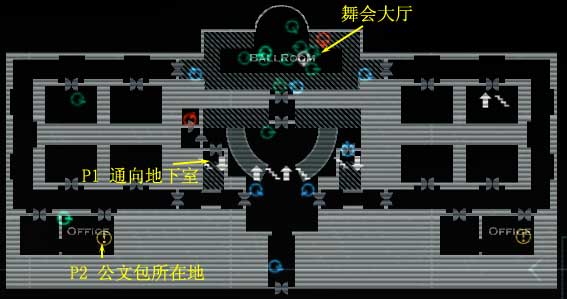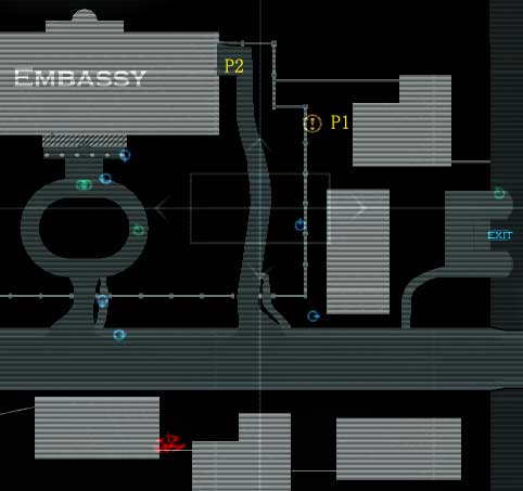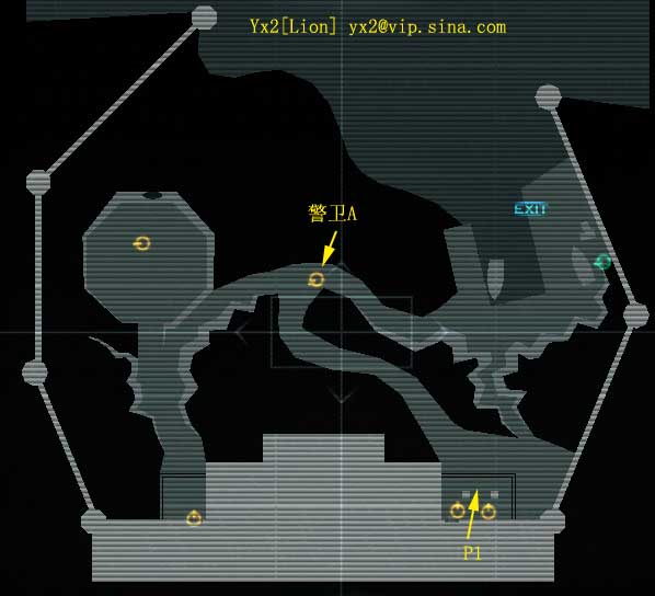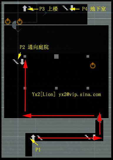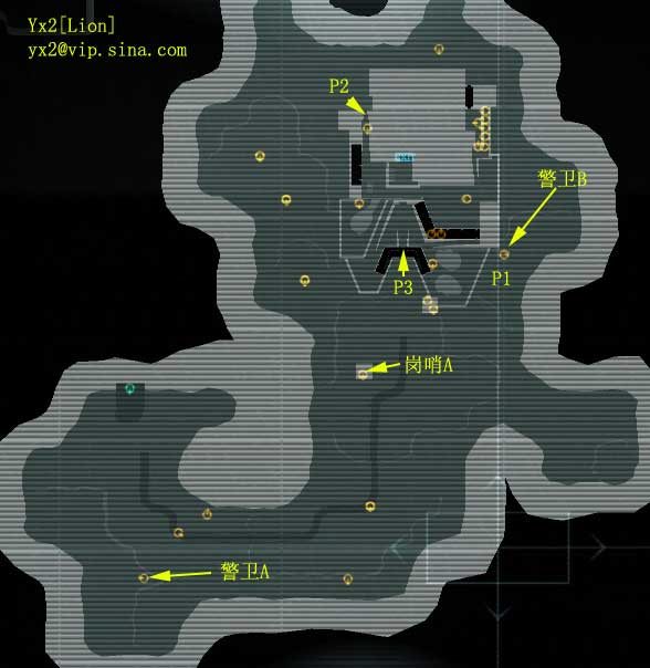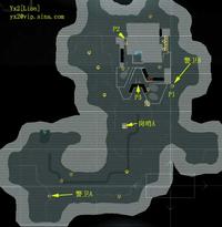 [先潜伏到P1位置,(通过玻璃的时候要爬过去)等房间里面的人离开后,赶快到P2点打坏保险丝,引起停电,然后去开保险箱拿钱,再去拿雕像,最后回到P1。等电工修好保险丝后再打断它一次,这次潜入到Charlie Sidjan房间的门口,在门口附近用消声手枪干掉他。(一定要在门口,再靠近一点都会被里面的几个女的发现)最后到脱离处逃离。] |