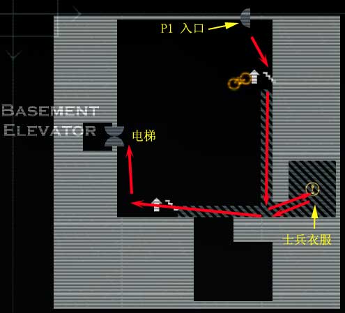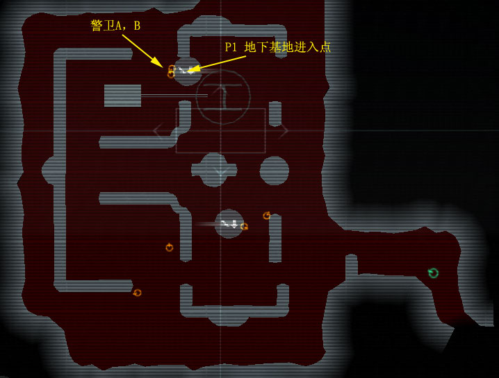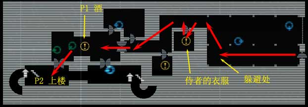 [从P1出来后,先到P2。在P2点会有一个外面巡逻的警卫进来休息,当他坐下的时候慢慢走过去绞死他,然后换上衣服把尸体拖到P1附近。] |