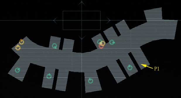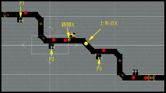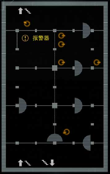 [要从P1到P2必定会被警卫A发现(有一个在过道巡逻的警卫要躲过),不过只要走的快,先到P4附近躲一下就不会响警报,第2个发电机在P3,第3个在P4。] |