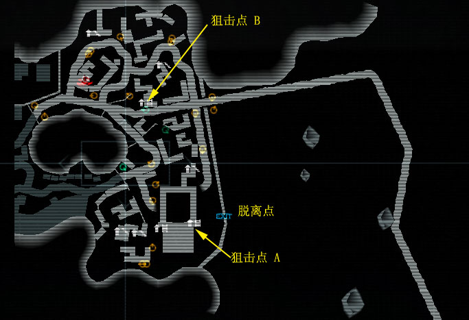 [拿了武器之后可以到狙击点A或者B等待目标出现,狙击点A需要换衣服才能到,击中目标的难度比较大,但是距离脱离点近。狙击点B其实不用换衣服就能到,但是很容易就被发现,而且离脱离点很远,Expert难度的话可能没跑到就被打死了,不过这里狙击比较容易击中目标。] |