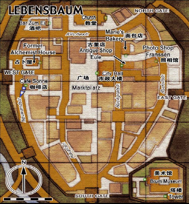 Eike在街上转悠,来到照相店门口时注意到了金属招牌,就跳起把它摘了下来,这可以代替金属盘子。经过酒吧时老板请他喝咖啡,但是完了又要向他收钱,Eike哪里有这个时候的货币?好在老板允许他赊欠。接下来逛到Antique Shop(新地图上的古董店,在过去是屠宰店),得到一块肉。最后回到Alfred Bruma家里,按照Sibylla的要求换上白袍戴上面具跟他们一家人合影留念。他准备离开时Sibylla提到他随时可以用“那把钥匙”回来,令Eike感到莫名其妙。