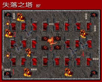 失落之塔8F:这里有大量的死神戈登和死神骑士,还有恶魔。地图的中间是魔王的巢穴。失落之塔的最高层是打宝的绝佳场所。