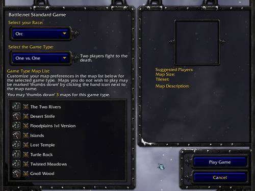 BN的主要功能是提供游戏的Ladder服务,供玩家参与。这部分在新的BN系统中也有很多非常不错的改进。首先是在BN的主画面上新增了快速游戏按钮。通过这个按钮能够根据玩家最后一次进入Play Game时页面所作的设定快速开始搜寻游戏,而不用专门进入Play Game的页面。另外在Play Game的页面里,在所使用的地图部分。原有的BN不限制玩家关闭的地图数量。但是玩家即便是关闭了某个地图,该地图却还有一定的几率会被选中。只是比未关闭的地图几率小一些而已。而在现在的系统中,玩家只能够关闭一定数量的地图(如:Solo Ladder是3张)但是被关闭的地图无论如何也不会被选中。另外,在游戏搜寻的时候,会显示一个平均搜寻时间。估计能够搜寻到游戏的平均时间。如果玩家在搜寻游戏时切换出了魔兽争霸,而转而去做别的事情。则在搜寻到游戏,并开始的时候,系统会自动切换回魔兽争霸中。