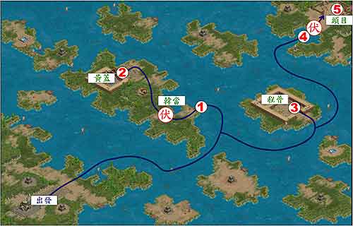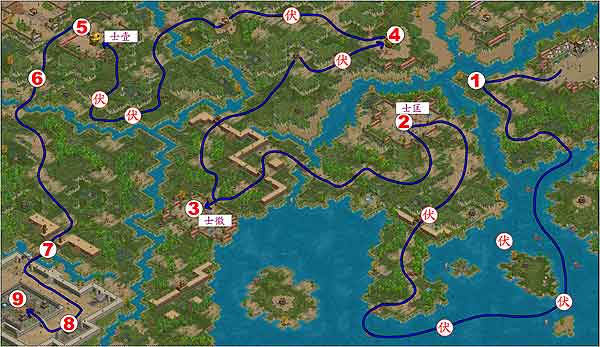 从开始处编队,编好之后,往下走出海以后继续向下走到右下角,该处有伏兵。解决该处伏兵之后转向左,可碰士祇。将士祇打退之后,上陆进入城门,军寨是士匡,抢下该处军寨之后可以进行回复和补给。记得将本阵的人带来此处镇守。向左过门,可以见到士徽,打完士徽之后,也要记得留兵在此处。将刚刚这两处军寨守好,就可以继续向上发兵,顺序打下两处,士壹并不很强,打完后山越援军前来攻打之前两处军寨,立刻转去进行防守。守下来之后才继续发进。城外的的两座箭塔根本不要打,用疾行快速冲过就可以了,冲入城内先打兵哨,然后在该处勾引士燮出战,将士燮干掉之后再上去扫平兵哨,最后进占城中,任务完成。