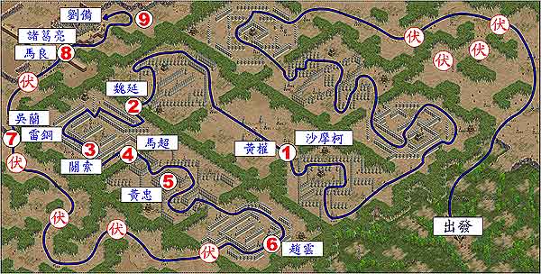 从出发点向上一直上去,沿着最右边的路一直上到最上方,左转之后可以碰见伏兵。穿过两次伏兵之后,可以抵达八阵图。过了前面三个阵之后,往上转上来,会碰见黄权和沙摩诃。建议之前的兵哨根本就不要打,将物资多留一些下来之后使用。打完黄权与沙摩诃之后直接向左上穿过中央阵,然后避开兵哨站,直扑魏延。将魏延打挂之后,连续将关索打败,而后稍事恢复,派一将前去将马超引来,然后擒杀。马超打掉之后,往下走可战黄忠,唯独赵云在的兵哨前,最好不要让他与兵哨战的火力连通。将这些将领都打完之后走出八阵图,连续穿过三次伏兵,最后可以碰上吴兰与雷铜。再往上通过一次伏兵,可以打到诸葛亮和马良。打倒之后,擒杀刘备大获全胜!