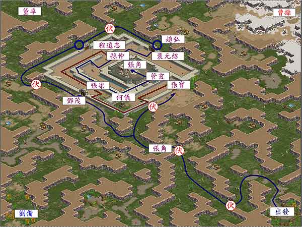 从出发地点往上走,转左再转下,可以碰见第一次伏兵。将伏兵解决后往左上走,在此处有第二次伏兵。此次伏兵一定要解决,因为之后就是张角。把张角击退之后,往左上进兵,然后转上到和守门将军韩忠交战。杀死韩忠之后观察目前的战场状况,如果刘备退兵,表示要到左下门去打邓茂,曹操退,表示要去右上门打赵弘,这些战场状况都要注意,反正不管如何,一定要将四门守将击退,之后门才会开,进入城中。如果你从韩忠处进门,会碰到张宝。张宝是个妖术很强的家伙,将其打退之后,往左上城楼,然后下来可以打张梁,如果张梁被击退,表示已经有人先冲入了!立刻往上转右,然后转下来从右边城楼上去,之后往下走,可以打到何仪。何仪打完是管亥,之后才是张角。如果张角变化成白虎精,则可立刻涌上杀之,大量放技换血,打完此妖,本关过矣!