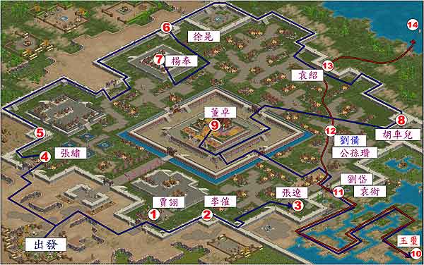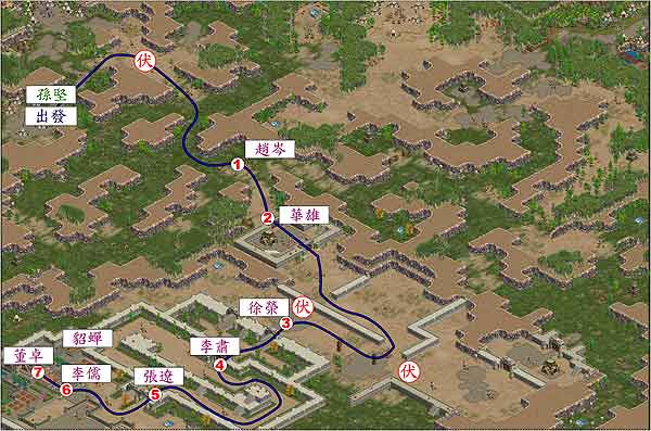 从出发地点往右上走,之后转右下,可以碰见第一次伏兵。将伏兵解决后往右下走,转过一个小弯口之后可以见到赵岑。把赵岑击退之后,往右下进兵,打破大门。将大门打破之后,派一剑士冲往关内引诱华雄出战,然后在门外将华雄擒杀,这样做的好处是可以避免汜水关的快箭伤害我方将领。杀死华雄之后,往右下绕上来,然后打倒徐荣。在他之前会有一阵伏兵,先用朱治将他们引出,之后才解决,然后最后才去打徐荣。徐荣是个很强的将军,要小心对付。徐荣挑下来之后便可以往内走,在里面轻松解决李肃,然后绕下去往上走,遇见张辽。打张辽没有什么特殊的办法,只有硬干。选择防御力最强者让他上场去吸引张辽,然后让他当肉靶让张辽追杀,之后其它人狂殴张辽。得胜之后往左下转上,可以看见李儒。此时若不是有人进来抢攻,最好是将李儒与董卓分开击破,因为他是文将,拥有补血的技巧。最后是董卓,打完他之后就可以攻破此关,大家快上吧!