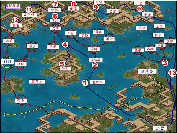 进入本关之后,你只有四个人;首先,先去占领村庄。不管你打算占领的是哪几个村庄,一定的时间之后,太史慈就会死掉。太史慈死掉之后,军寨部分就会出现孙权的大军,之后就会改变战略,要全力反攻曹操。首先先将外面的武将撤回本阵,然后进行一下恢复和补给。接着派遣武将出去到(军寨左右,守住此两处,军寨就不会受到袭击。然后从寨本部将部队分为两股,在左侧遇上于禁和曹仁会拦路,最后在左上与李典、夏侯惇作战,打完徐晃之后原地暂留,换另外一部动作。另一队从右出发,沿路打下五处兵哨,之后碰上曹洪、庞德,将其引开后各个击破。之后打下曹丕和甄姬。过桥之后可以打到曹彰与贾诩,打完以后两队合击中间的张辽及乐进。之后往上入城,在城中击败荀攸、许褚、曹操,这关结束。