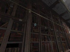 Leave the room, turn left, go forward, turn right and go forward through the door which takes you to the main part of the LIBRARY. Turn to your right and look at the top of the ladder. A letter will fall and you will read it. Climb up the ladder and move the lever. You can click on the ball in front of you but it will not stay open. Go down the ladder and to the left of it as far as you can then pan the bookcase to your right until you get the Look cursor.